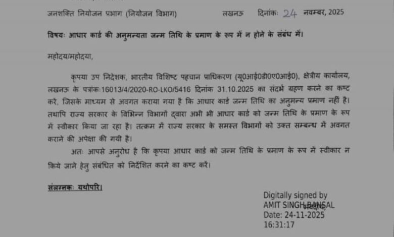 DOB document changes – उत्तर प्रदेश सरकार ने आधार कार्ड को जन्मतिथि (Date of Birth) या जन्म प्रमाण पत्र के प्रमाण के रूप में मान्य करने पर रोक लगा दी है। इस संबंध में विशेष सचिव, नियोजन विभाग **IAS अमित सिंह बंसल** ने आधिकारिक आदेश जारी किया है।