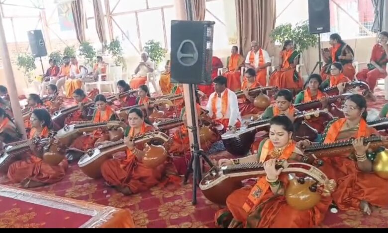 AYODHYA-RAM-MANDIR:उत्तर प्रदेश की राम नगरी अयोध्या में दर्जनों वीणा के मधुर समवेत स्वर से गुरुवार को श्रीराम जन्मभूमि मन्दिर का सम्पूर्ण परिसर झंकृत हो उठा। हैदराबाद के सरकारी संगीत और नृत्य कालेज से पधारी 74 संगीत साधिकाओं ने वीणा के समवेत स्वर से प्रभु श्रीराम की आराधना की।