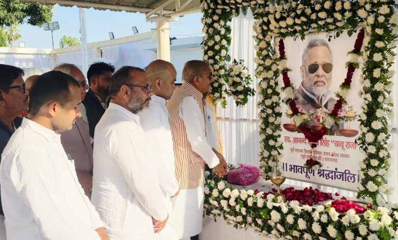 Pratapgarh: प्रतापगढ़ जिले में पूर्व विधान परिषद सदस्य आनंद भूषण सिंह उर्फ बब्बू राजा की 13वीं संस्कार के अवसर पर सोमवार शाम श्रद्धांजलि सभा का आयोजन किया गया। इस मौके पर राज्यसभा में विपक्ष के उप नेता और वरिष्ठ कांग्रेस सांसद प्रमोद तिवारी कटरा स्थित रानी रामप्रिया गार्डन पहुंचे और स्वर्गीय बब्बू राजा के चित्र पर माल्यार्पण कर उन्हें भावभीनी श्रद्धांजलि अर्पित की।