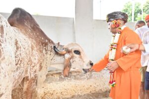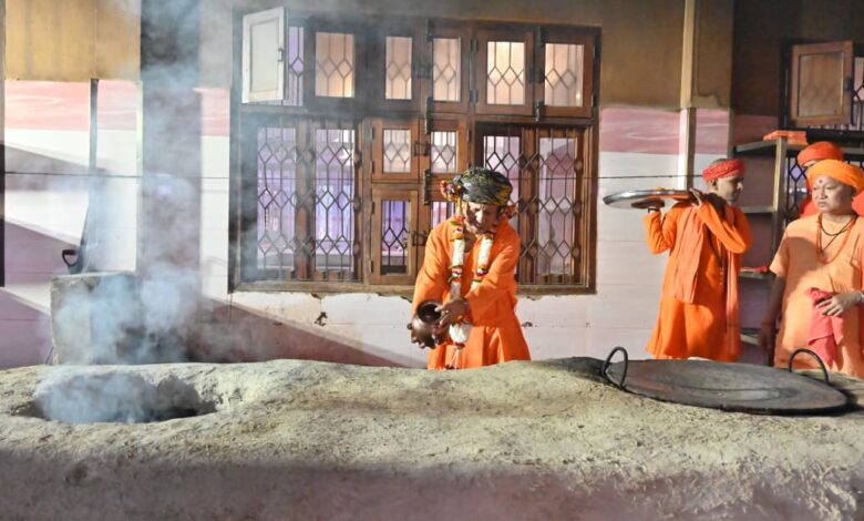 Gorakhpur News- गोरखनाथ मंदिर में विजयदशमी के विशिष्ट पूजन के क्रम में गोरक्षपीठाधीश्वर एवं मुख्यमंत्री योगी आदित्यनाथ ने गुरुवार को मंदिर की गोशाला में गोपूजन किया। गोमाता के माथे पर तिलक लगाकर उनका आशीर्वाद लिया। पूजनोपरांत मुख्यमंत्री ने गोमाता को प्रेम और श्रद्धाभाव से गुड़, पूड़ी और चावल का लड्डू खिलाकर उनकी सेवा की।