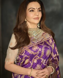 इस खास मौके के लिए नीता अंबानी ने गहरे पर्पल रंग की बनारसी साड़ी पहनी, जिसे तैयार करने में करीब चार महीने का समय लगा। साड़ी में पारंपरिक जंगला जाल पैटर्न और गोल्डन फ्लोरल मोटिफ्स का बारीक काम किया गया था। इसमें असली जरी और तीन रंगों की मीनाकारी का इस्तेमाल हुआ, जिसने साड़ी को बेहद शाही और आकर्षक लुक दिया। इस तरह की बारीक कारीगरी भारतीय हस्तशिल्प की समृद्ध परंपरा को दर्शाती है।