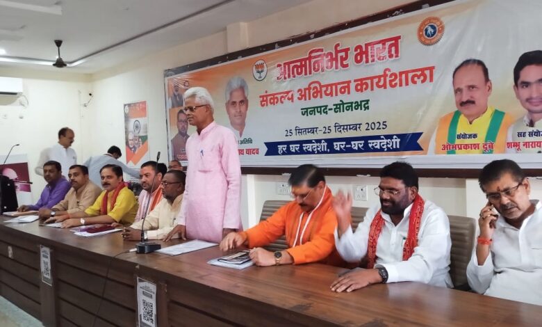 Sonbhadra News-भारतीय जनता पार्टी द्वारा आत्मनिर्भर भारत संकल्प अभियान व शिक्षक व स्नातक एमएलसी चुनाव की संयुक्त कार्यशाला भाजपा जिला कार्यालय पर सम्पन्न हुयी। कार्यशाला में बतौर मुख्य अतिथि काशी क्षेत्र के क्षेत्रीय उपाध्यक्ष अमरनाथ यादव व पूर्व विधायक व एमएलसी चुनाव संयोजक वाराणसी क्षेत्र सुरेन्द्र सिंह मौजूद रहे। संयुक्त कार्यशाला का शुभारंम्भ पं0 दीनदयाल उपाध्याय व डॉ0 श्यामा प्रसाद मुखर्जी के चित्र पर पुष्प अर्पित व दीप प्रज्ज्वलन कर किया गया। इस कार्यशाला की अध्यक्षता भाजपा जिलाध्यक्ष नन्दलाल व संचालन जिला संयोजक ओमप्रकाश दूबे और कृष्ण मुरारी गुप्ता ने किया।