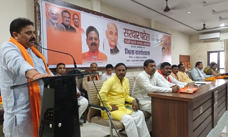 Sonbhadra News-भारतीय जनता पार्टी लौह पुरुष सरदार पटेल की 150 वीं जयंती समारोह को सफल बनाने के लिए एक जिलास्तरीय कार्यशाला का आयोजन जिला कार्यालय पर आयोजित किया। इस कार्यशाला में बतौर मुख्य अतिथि राज्यमंत्री व जनपद के प्रभारी मंत्री रवीन्द्र जायसवाल मौजूद रहे। जिला कार्यशाला की अध्यक्षता भाजपा जिलाध्यक्ष नन्दलाल व संचालन कार्यक्रम संयोजक प्रसन्न पटेल ने किया।